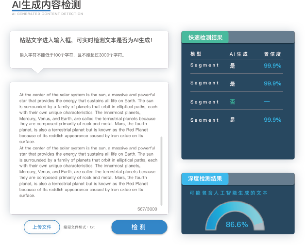 系统是一款基于自主研发算法实现的人工智能生成内容检测系统。它可以有效鉴别图、文等多媒体内容是否由GPT类多模态大模型算法所生成,以解决日益严重的虚假文本、多媒体数据泛滥的管控与治理难题。