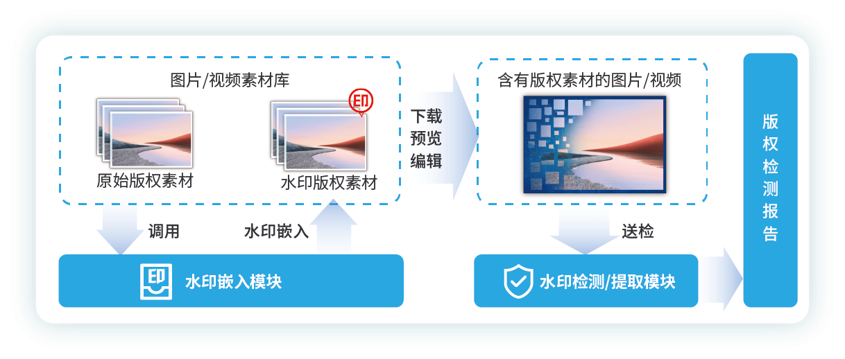 系统基于信息隐藏和AI检测技术开发,可将版权信息隐藏在图片、视频等版权作品中,实现版权作品在源头上的确权。通过AI快速检测技术实现对版权信息的精准提取,为版权维权提供有效证据,为版权交易提供有力支撑。